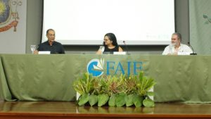 O segundo dia do Simpósio, no dia 9, foi aberto com a mesa-redonda com o tema “Ecologia e Capitalismo”, no auditório Dom Luciano Mendes de Almeida, no campus da FAJE. Participaram a Profa. Dra. Mariza Rios (Centro Universitário Dom Helder) e o Prof. Dr. Élio Gasda SJ (FAJE),com a moderação da Profª Dra. Cláudia Maria Chaves de Oliveira (FAJE). Em sua palestra, o Prof. Dr. Élio Gasda abordou o tema “Sociedade, Ecologia e Capitalismo”, destacando que o mundo vive uma crise profunda e que, na raiz dessa crise está o ser humano, sendo o sistema capitalista sua maior causa.